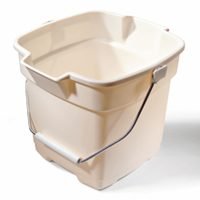 Heavy duty wire bails offer extra durability for heavy use. Twin spouts guide water flow from either side. Recessed grips on bottom allow easy controlled pouring. Handle grips designed for comfortable carrying. 12 quart. 11.5" x 12.5" x 10". No. FG29640- Rubbermaid #2964-00BISQ 12QT Bisque Bucket